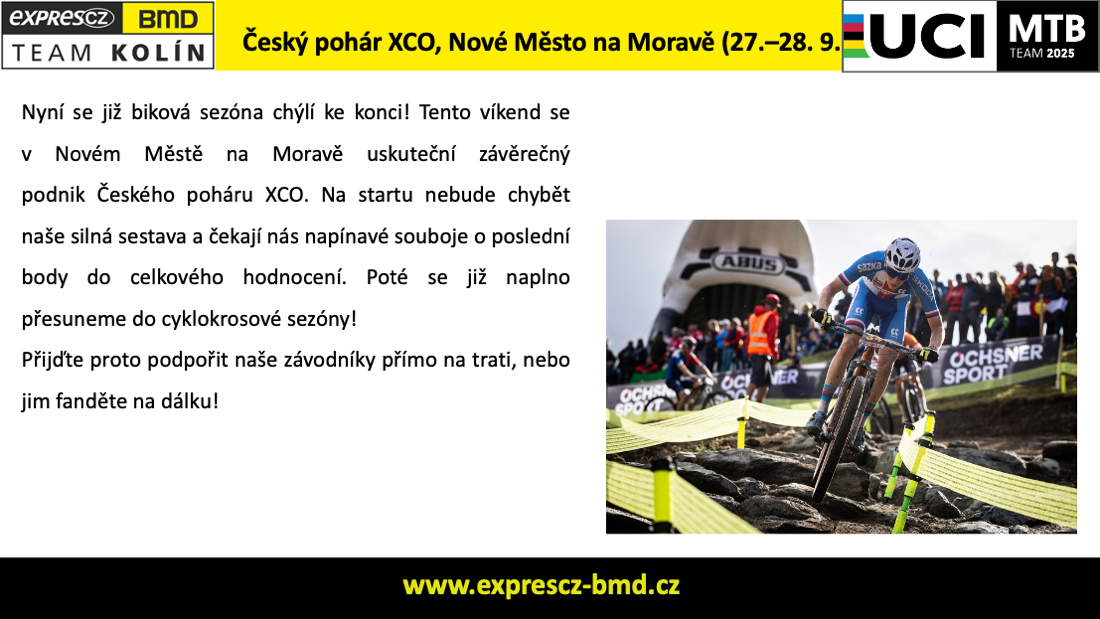 V přiloženém zpravodaji naleznete krátké zhodnocení výsledků i pozvánku na poslední závod Českého poháru XCO v Novém Městě na Moravě, který nás čeká tento víkend.